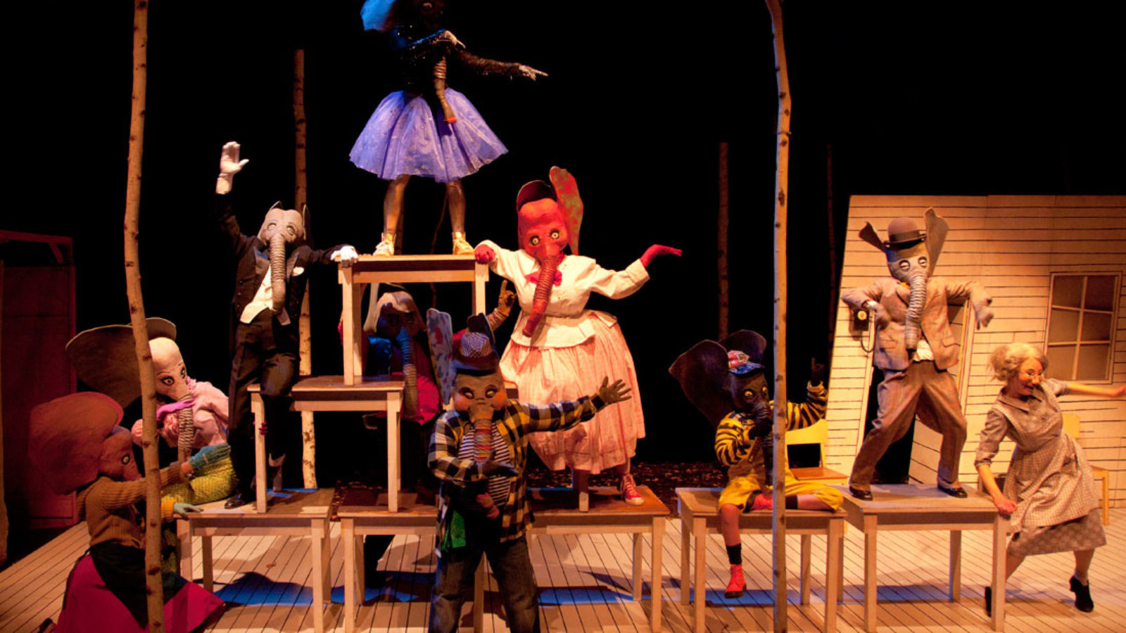 Une jolie fable, une jolie leçon de mobilité perpétuelle que l’on peut résumer théâtralement par le principe de l’espace scénique qui n’arrête pas de se remplir, de se remplir de tables, d’éléphants gris avec des tee-shirts bariolés, de gigots et de volailles en carton-pâte, de clients qui sont une ribambelle d’enfants avec des têtes fabriquées avec des cartons de chaussures, et puis tout se vide et est emporté par un grand camion rose qui débarrasse la piste. Une scène qui se vide et se remplit, c’est le b a ba de la poésie au théâtre disait Antonin Artaud. Il faut ajouter à cette poésie le ballet humoristique et pataud réglé au quart de poil et avec élégance par Rossella Riccaboni, la musique de quatre des meilleurs de la Fanfare du Loup qui crée une ambiance anglo-black avec saxos, trompette wahwah, banjo et contrebasse, et aussi la diction franglaise du récitant qui tient le fil des images.